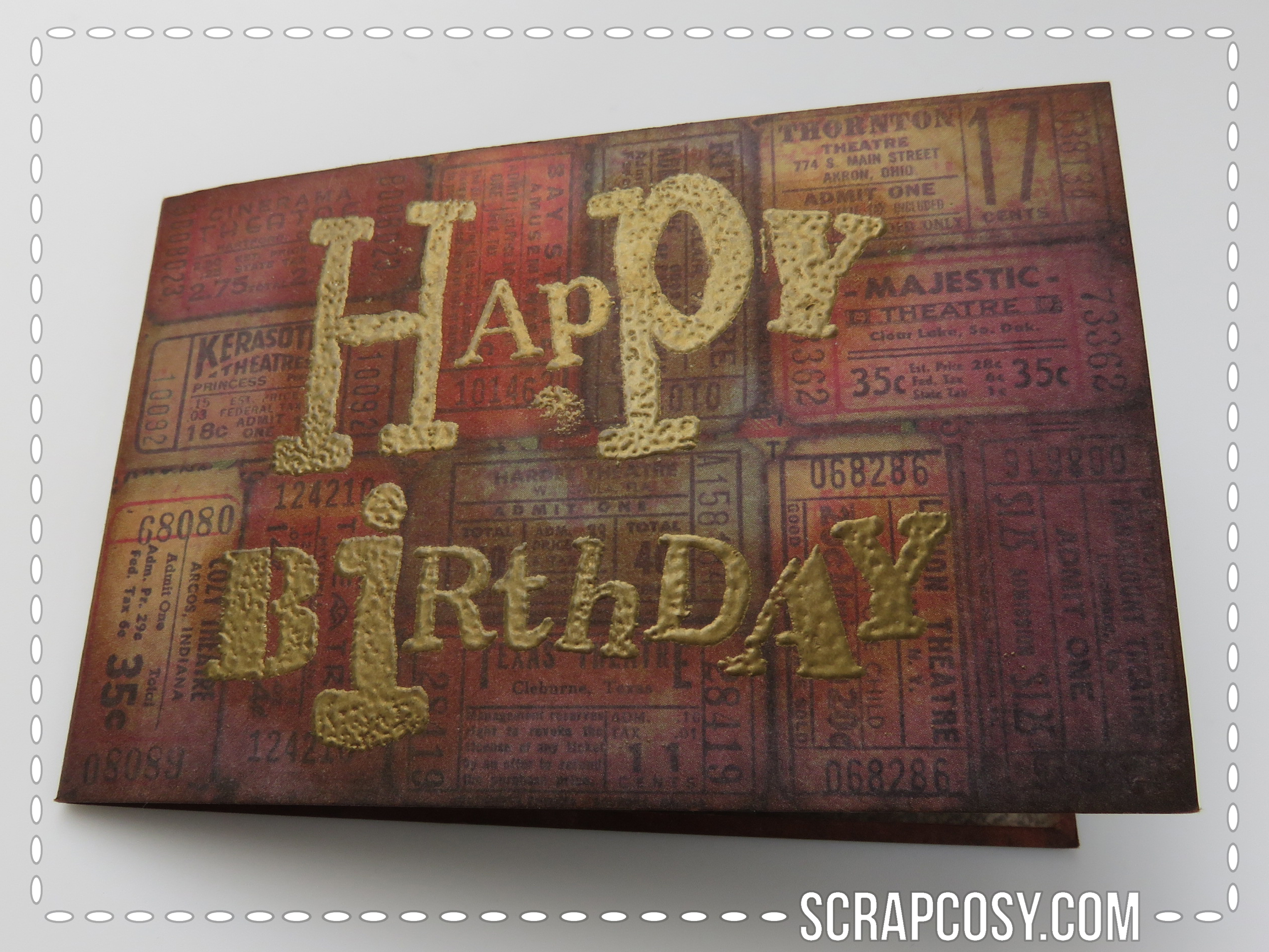Creé una pequeña tarjeta de 10cm por 6,8cm de un papel de Tim Holtz (pieza de 20cm por 6,8cm doblado a la mitad) y estampé y embosé un feliz cumpleaños en dorado. Entinté los bordes y el feliz cumpleaños con la foto con tinta distress vintage photo (si quieres destacar el embossing dorado se puede aplicar la tinta encima, por lo que el papel alrededor de las letras queda entintado pero las letras se pueden limpiar con una servilleta y volverán a brillar. Este es el resultado de la parte delantera de la tarjeta::