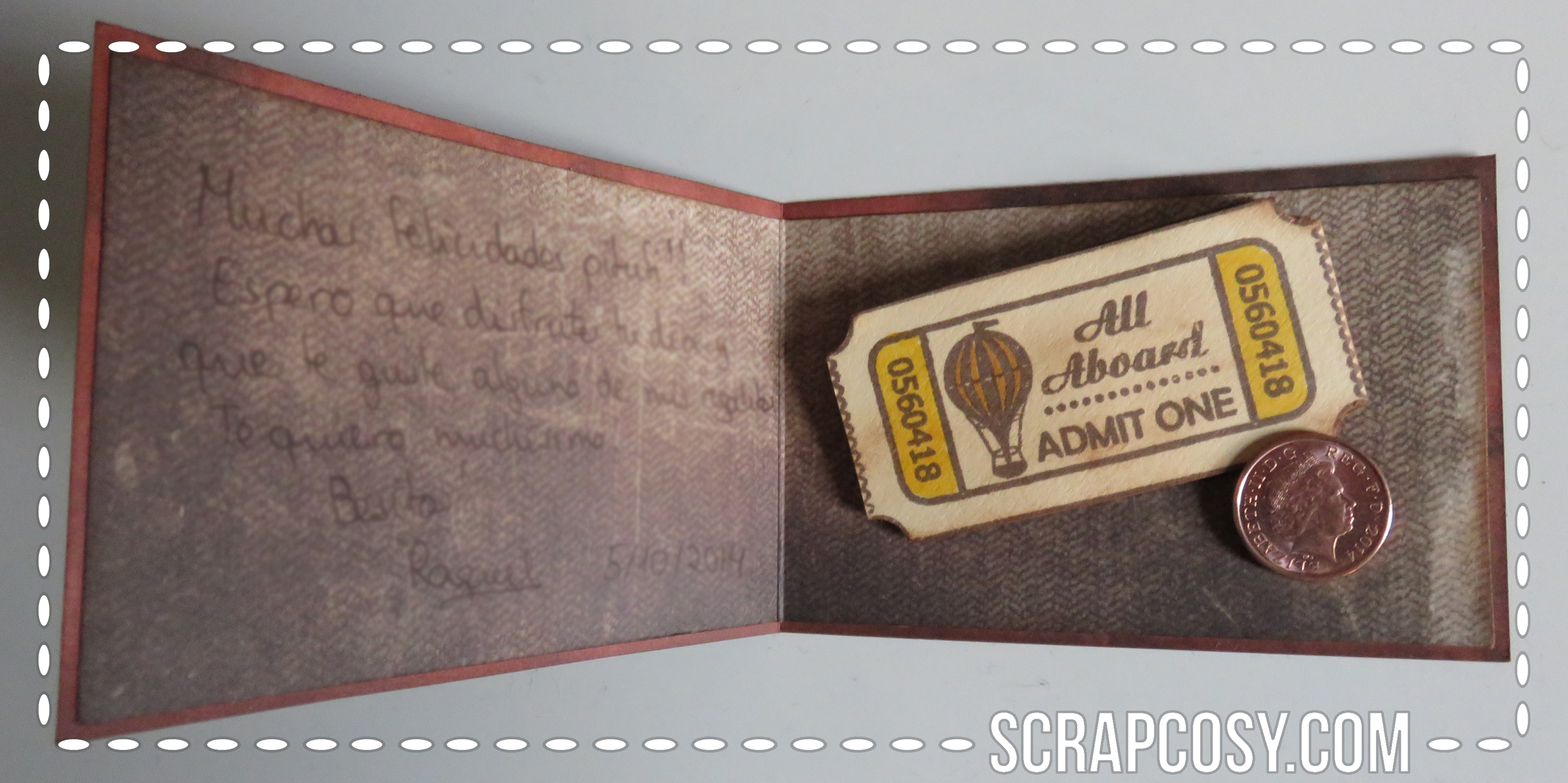This is the inside of the card. I cut another dessign paper from the same collection to a slightly smaller size (0,5cm less) and I sticked it to the base, centred. Then I used 2 glue dots to place the tickets folded and the penny. I wrote my card on the left.