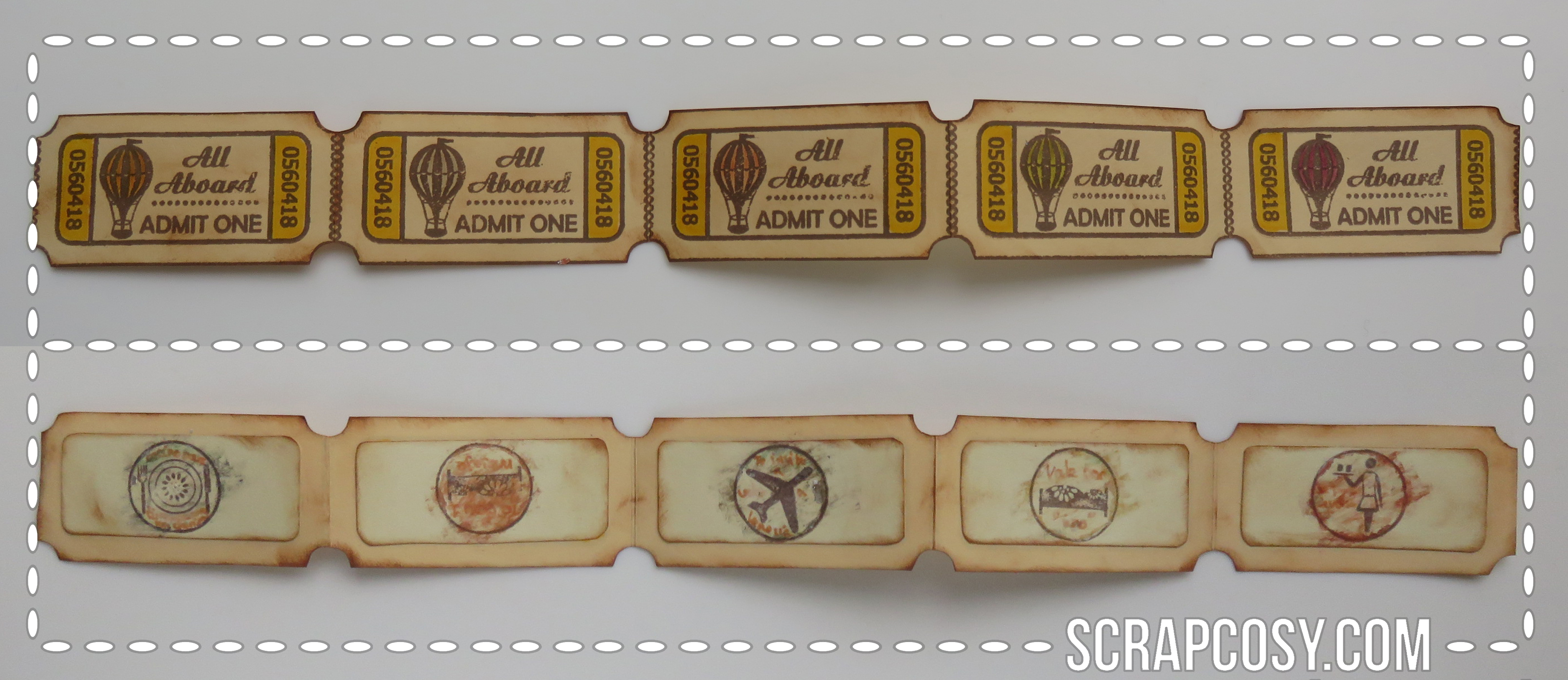I took a stripe of cream cardstock and I stamped 5 times the ticket, one side by side with the other, so they seem to be a stripe of tickets. Then I cut the stamps stripe (as below) I inked the edges with vintage photo, then I coloured the balloons and the tickets details with alcohol markers.