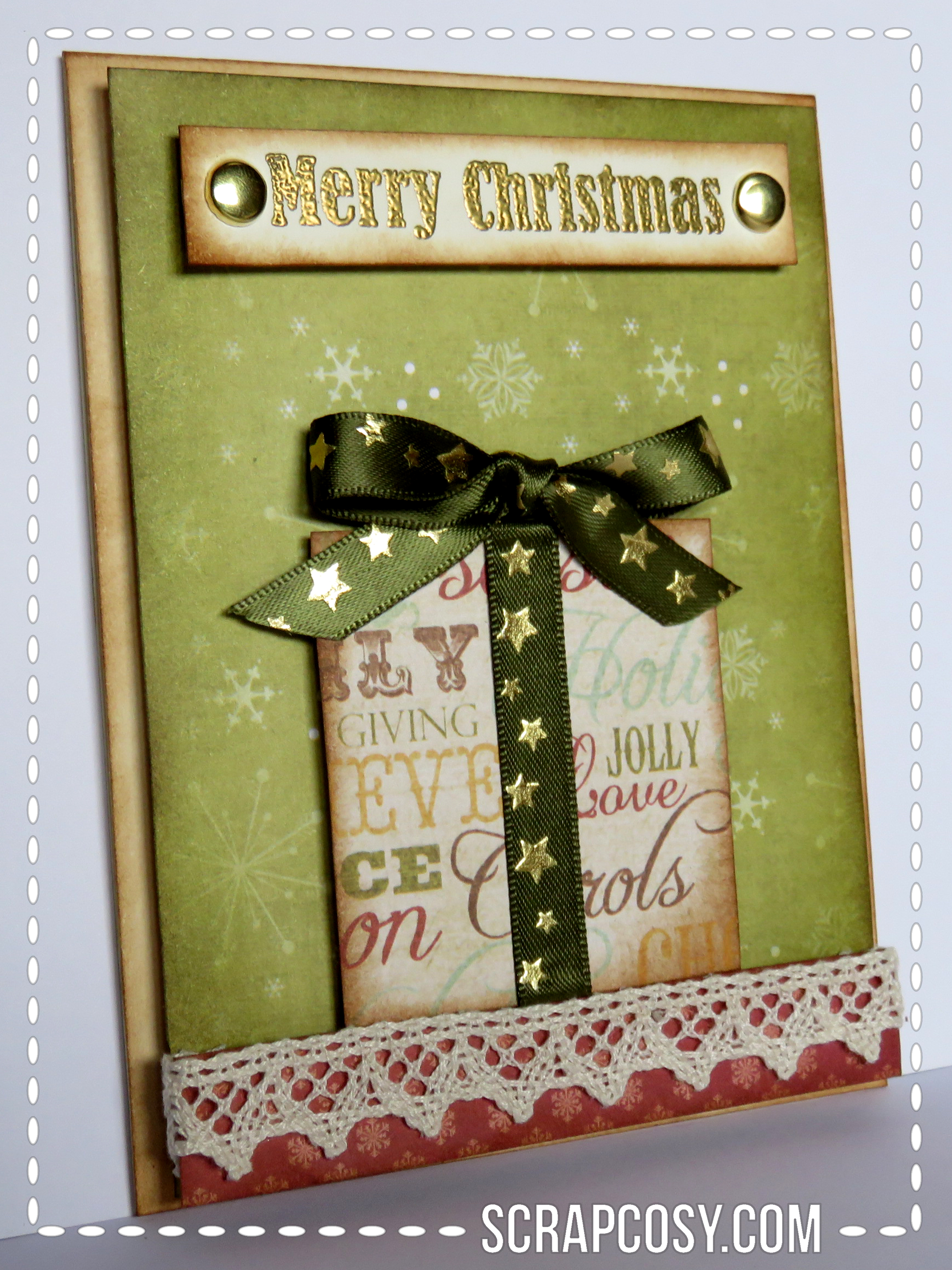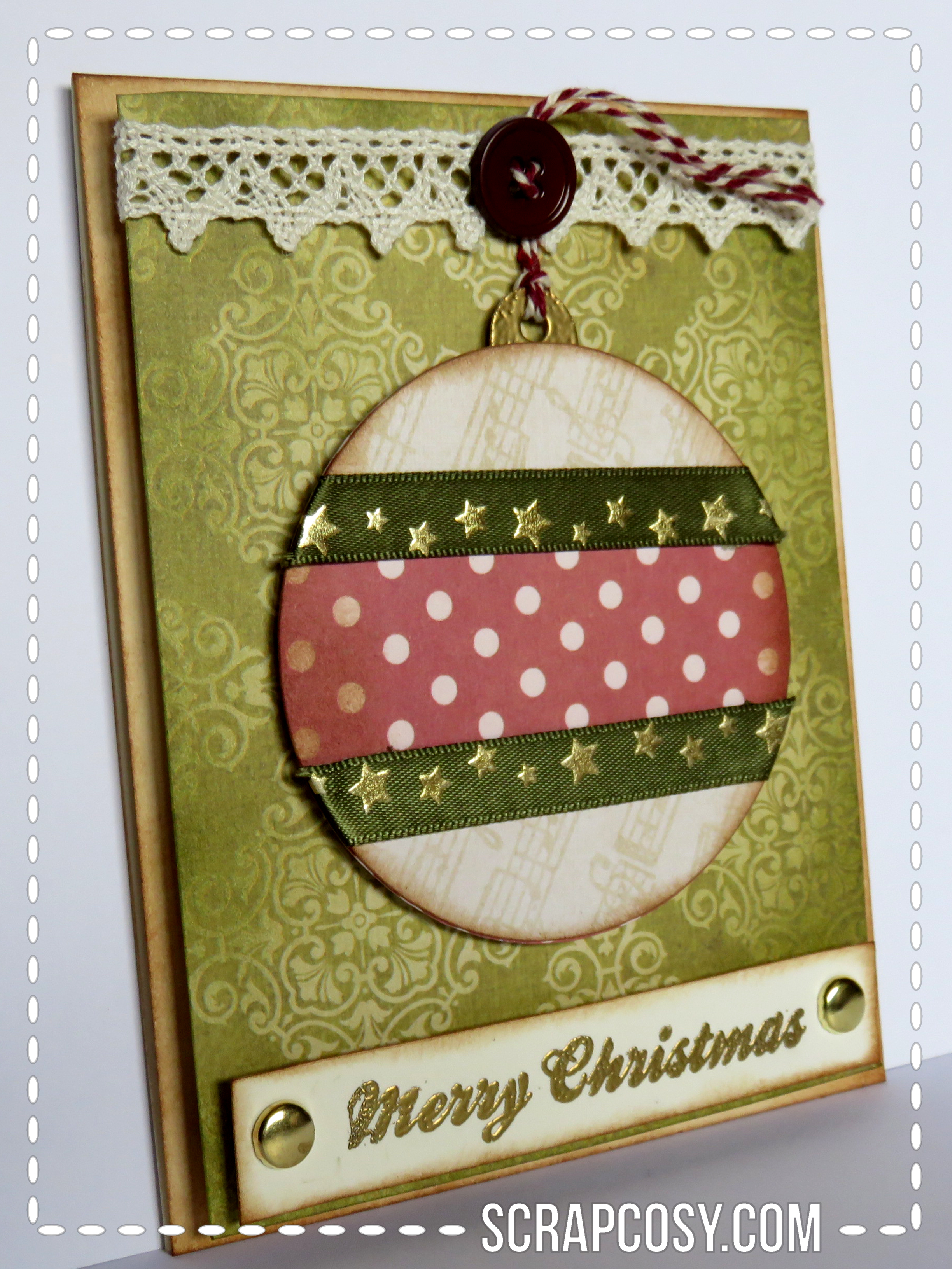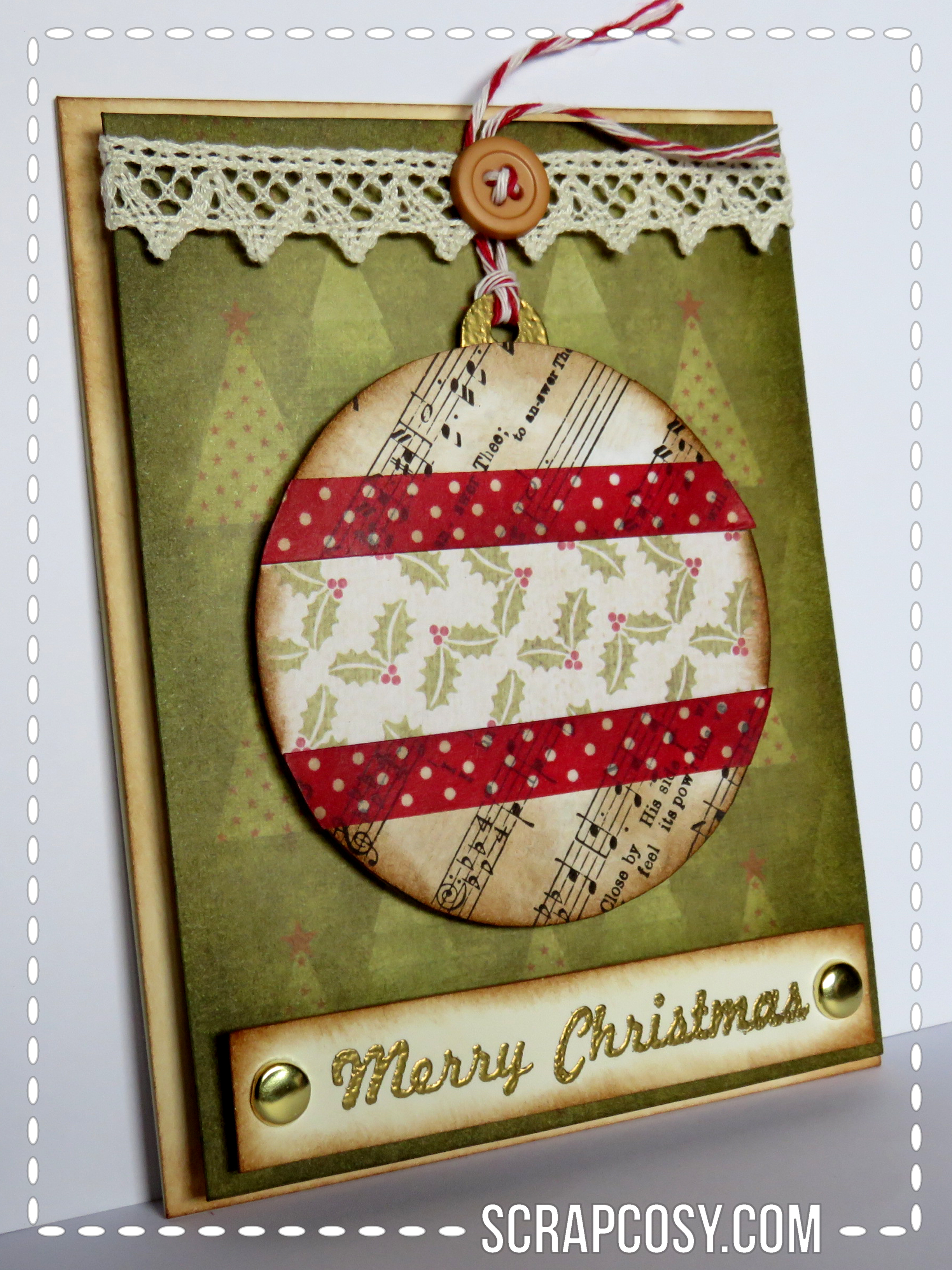 You can also see the faux stitching in this card. The stocking has a loop made of velvet ribbon from which the baker’s twine passes through and which helps securing the hanging to the lace.