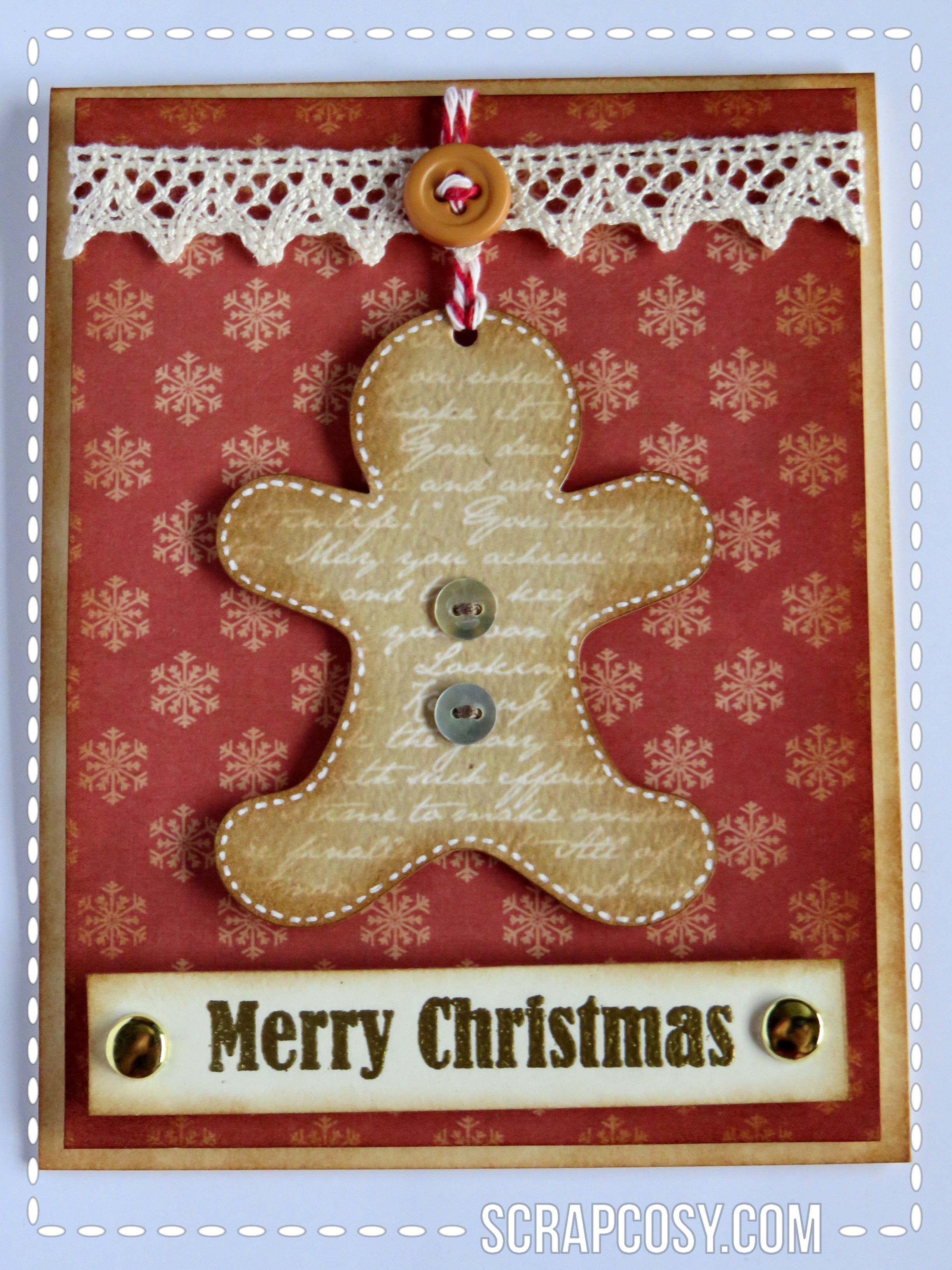 I always think of Shrek when I see one of these biscuits: “Not my gumdrop buttons!”  hehehe… In this case, the buttons are not sweet; they are made from Mother of Pearl. The biscuit has a faux stitching in white and it seems it’s popping up from the card thanks to the foam adhesive. Same as for the remaining cards (except for one), it has a lace and a button from which a baker’s twine comes out down to the focal point (in this case, the gingerbread man) so the focal point is hanging from it.