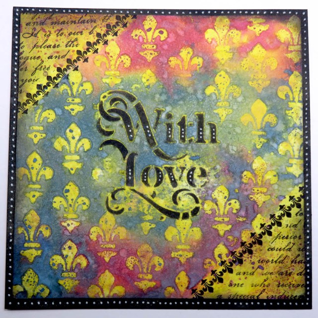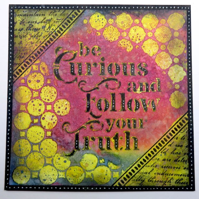 Stencils are very versatile, and in this case for this sample I went for a flat finish, no volume, created with distress oxides. But you can use many other things with them: fresco paints, infusions and glaze, ink sponged through or just a spray. Or you can go for volume and apply Grunge Paste to create 3D sentiments. I decided to incorporate the same sentiment as one of the sets for this sample, but the stencil incorporates another sentiment (bloom like a rose) that would 100% match as well a previous stamp set of mine (ESC04). There are 2 patterns on this stencil and you could overlap them if you wished or you can just extend one of the patterns by repositioning it (I always try to allow that possibility, you never know how big your canvas will be!). I wanted open gaps in this stencil, so it can also be used with your gelly plates. I’ve made videos of all these samples, I’ll share them in YouTube once ready (and maybe Leandra will incorporate them here as well)