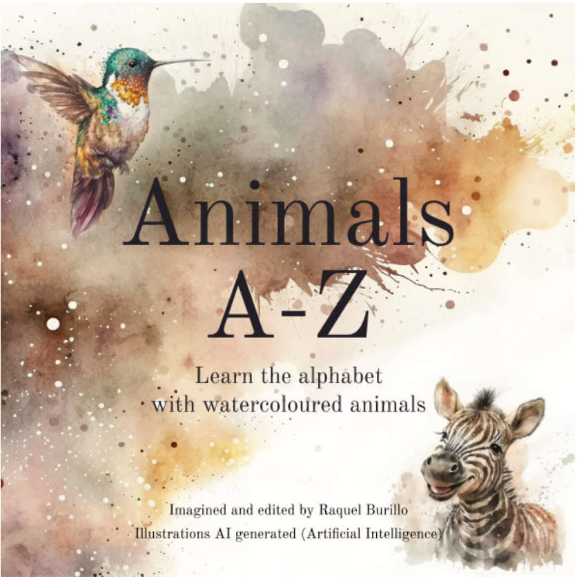 Learn the alphabet with watercoloured animals. A book that young learners will enjoy. These beautiful watercolured illustrations of 26 cute animals have been created by an AI upon the precise instructions given by Raquel. An experimental experience, edited with love and for a fun read. One page per animal and the animal name is written in capital letters