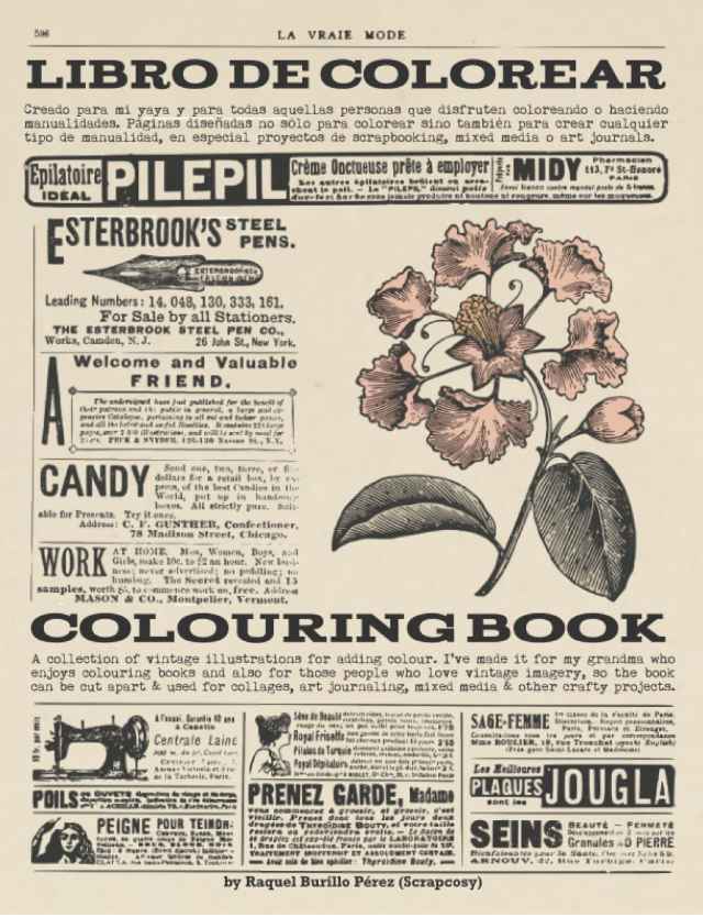 Printed in cream paper with black ink in a A4 size format with matt cover. The book contains 89 pages and on each double spread there is at least one big vintage illustrations for you to colour. I’ve made it for my grandma who enjoys colouring books these days, so I thought it would be a good gift for her. I hope you also enjoy it. Feel free to not only use this book for colouring but also to trim pieces out, use it for art journaling or for other mixed media projects or collages. Just promise me you’ll had fun!