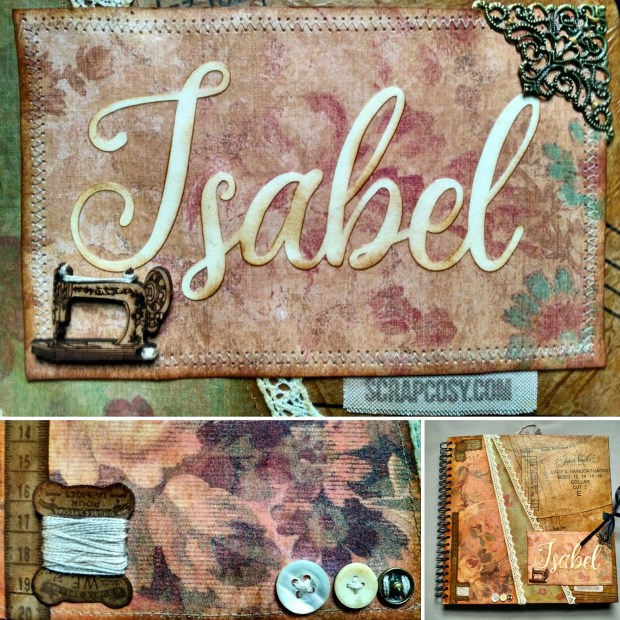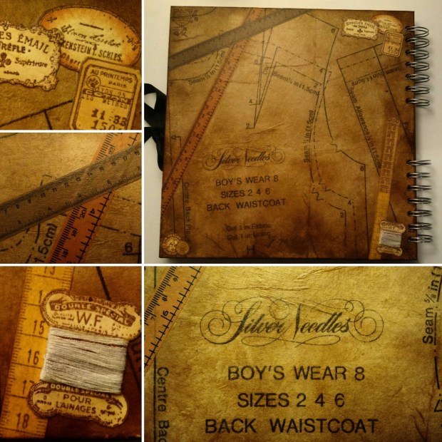 - 60’s birthday album – front. Isabel loves sewing, hence the details like the button, measuring tape and the pattern